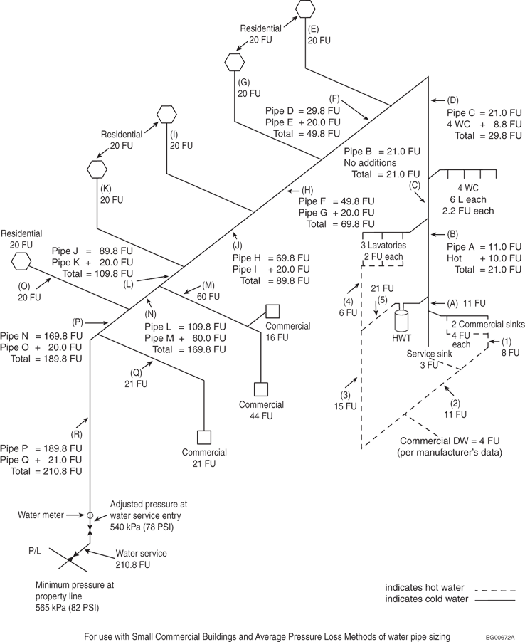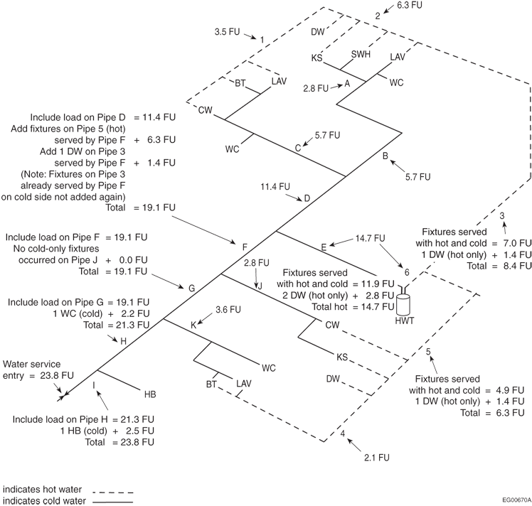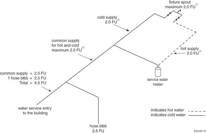 - Where the service water heater distribution pipe occurs, add in the fixture unit demand of the fixtures served with only hot water and those that have not yet been added in as served to the cold water side of the fixtures requiring both a hot and cold water supply.